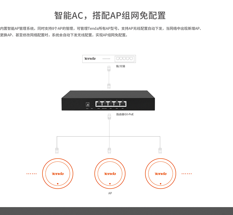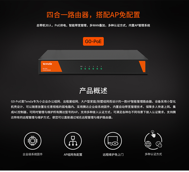 功能特性:騰達GO- POE 5口企業(yè)級POE路由器 AC一體機 智能AP管理 遠程維護