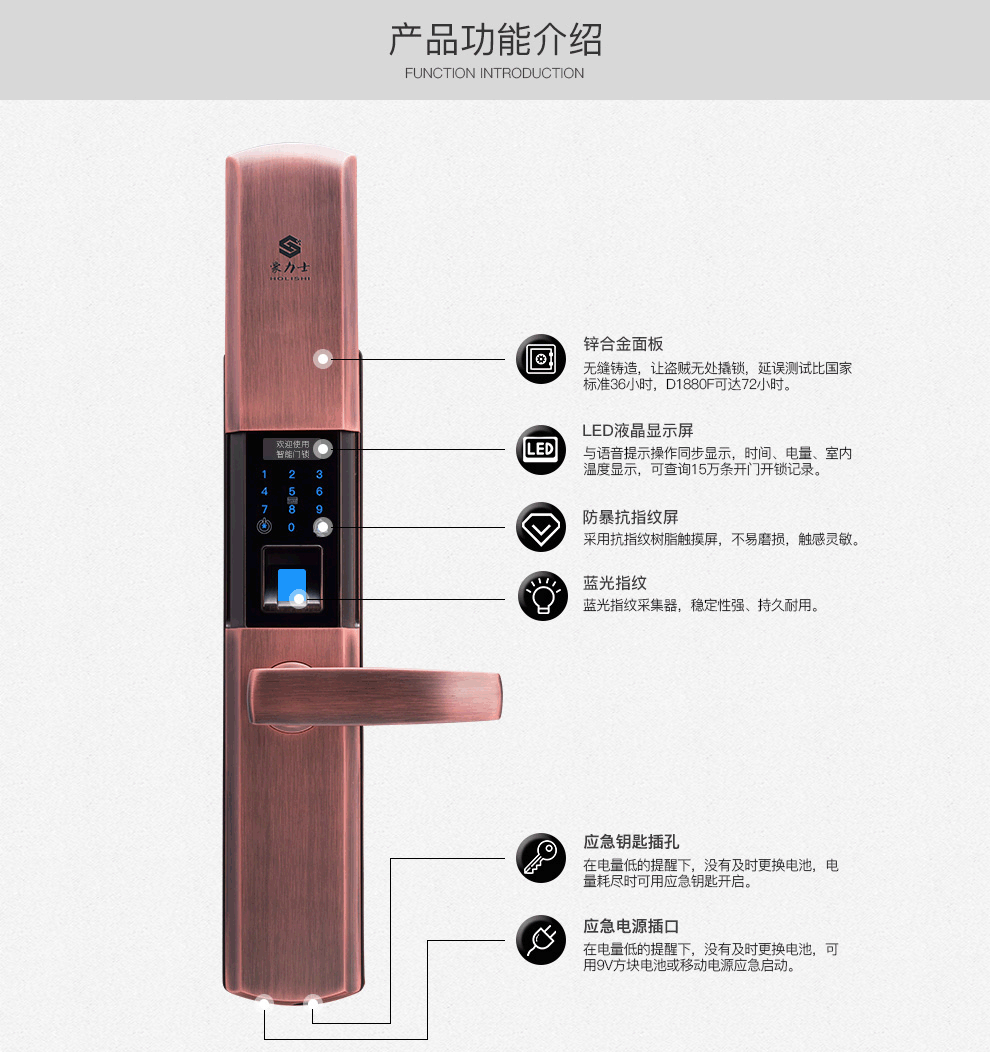 功能特性:智能豪華力士指紋門(mén)鎖高端三星防盜門(mén)智能鎖D1880F